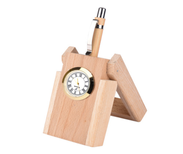 Classic Wooden Pen Holder Stand with In-Built Watch
