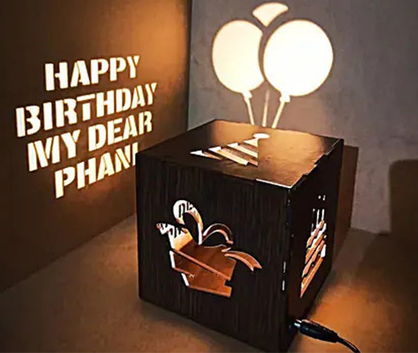 Happy Birthday Shadow Lamp: Celebrate in style with this charming shadow lamp designed for birthdays. Featuring a “Happy Birthday” cutout, it casts festive and joyful patterns on your walls, creating a warm and celebratory atmosphere. Ideal as a unique decor piece for birthday parties, it combines functional lighting with a personalized touch, making it a memorable addition to any celebration.