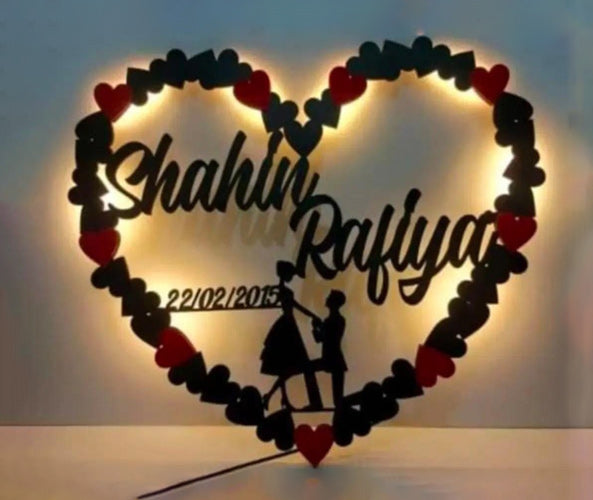 Heart LED Name Prop: Brighten up your space with this enchanting Heart LED Name Prop. Featuring a heart-shaped design with personalized names illuminated by LED lights, this unique decor piece adds a romantic and personalized touch to any setting. Crafted from high-quality materials like acrylic or wood, the LED lights provide a soft, ambient glow, perfect for creating a cozy and intimate atmosphere. Ideal for special occasions such as weddings, anniversaries, Valentine's Day, or as a heartfelt gift, this name prop serves as a beautiful reminder of love and togetherness. Its versatile design makes it a stylish addition to bedrooms, living rooms, or event decor.