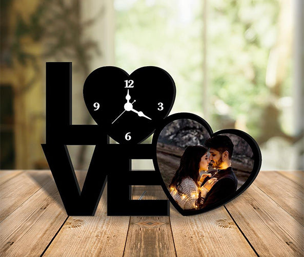 Love Wooden Photo Table Clock - Celebrate love and memories with this charming wooden photo table clock. Designed with elegance and warmth, it features a beautiful heart motif and spaces for your favorite photos. Perfect for bedside tables or desks, it adds a personal and stylish touch to any room.