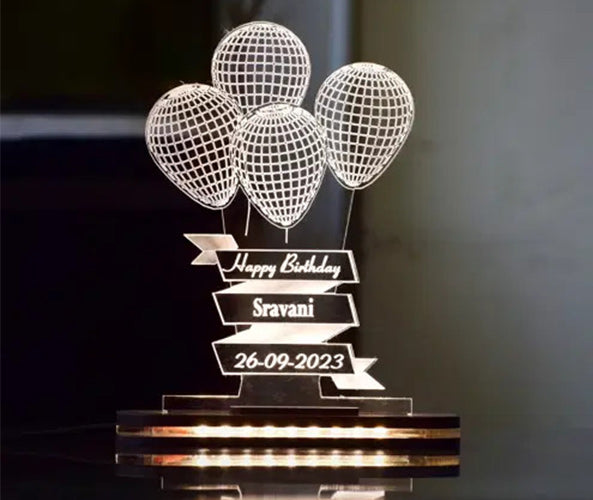Personalized Balloons Acrylic 3D Illusion LED Lamp with Color Changing LED and Remote: Add a playful touch to your decor with this acrylic 3D illusion lamp featuring a balloon design. Customizable with names or messages, it comes with color-changing LEDs and a remote control, allowing you to set the perfect mood. A fun and unique gift for birthdays or celebrations.