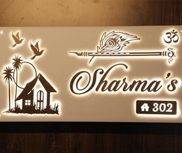 Personalized Home - Door Name Plate, White Acrylic with Lighting: Elevate your home's entrance with this sleek, white acrylic nameplate. Featuring custom engraving and soft integrated lighting, it ensures your family name or address stands out with elegance, day or night. The minimalist design offers a clean, modern look that complements any decor, making a stylish first impression.