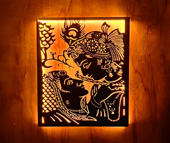 Radha Krishna Metal Wall Art Hanging With Backlight LED: Celebrate divine love with this Radha Krishna metal wall art, elegantly designed with LED backlighting to enhance its spiritual beauty.