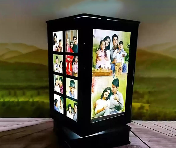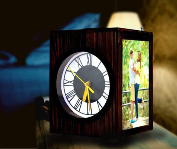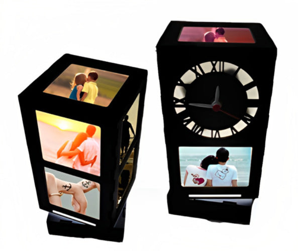 Rotating Lamp with Clock: Combine functionality and style with the Rotating Lamp with Clock. This innovative lamp features a built-in clock and rotating photo display, making it a versatile addition to any room. Perfect for showcasing your favorite photos while keeping track of time, this lamp adds a modern and personalized touch to your decor. Ideal for living rooms, bedrooms, or offices, it serves as both a practical and decorative piece. The rotating feature ensures your cherished memories are always in view, complemented by the convenience of an integrated clock.
