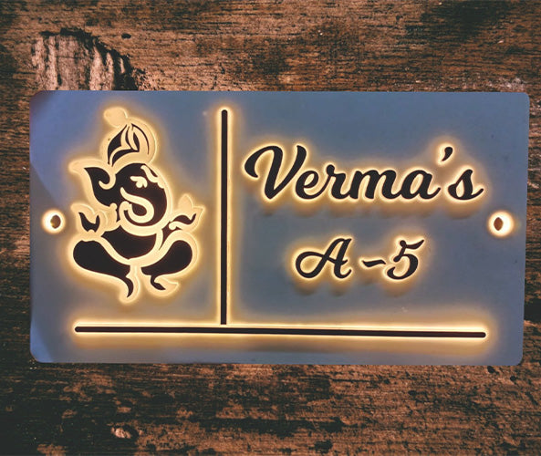 White and Black Acrylic LED Name Plate: Achieve a timeless and modern look with the White and Black Acrylic LED Name Plate. The striking contrast between the white background and black lettering is enhanced by LED lighting, ensuring your name or address is always visible, day or night. This design offers a sleek and contemporary aesthetic for any home entrance.