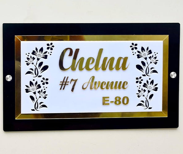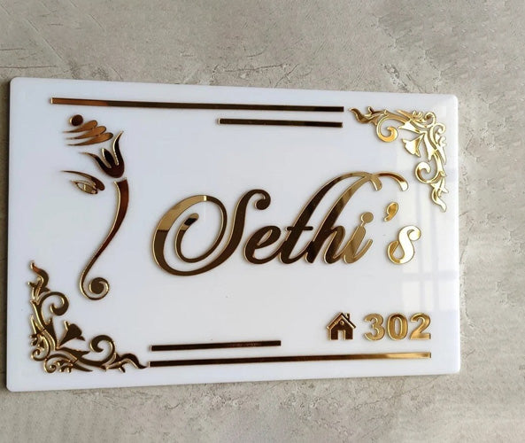 White and Golden Acrylic Home Plate: Make a striking statement with the White and Golden Acrylic Home Plate. This elegant nameplate combines a crisp white background with luxurious golden accents, creating a sophisticated look. Perfect for displaying your family name or address, it adds a touch of opulence to any entrance.